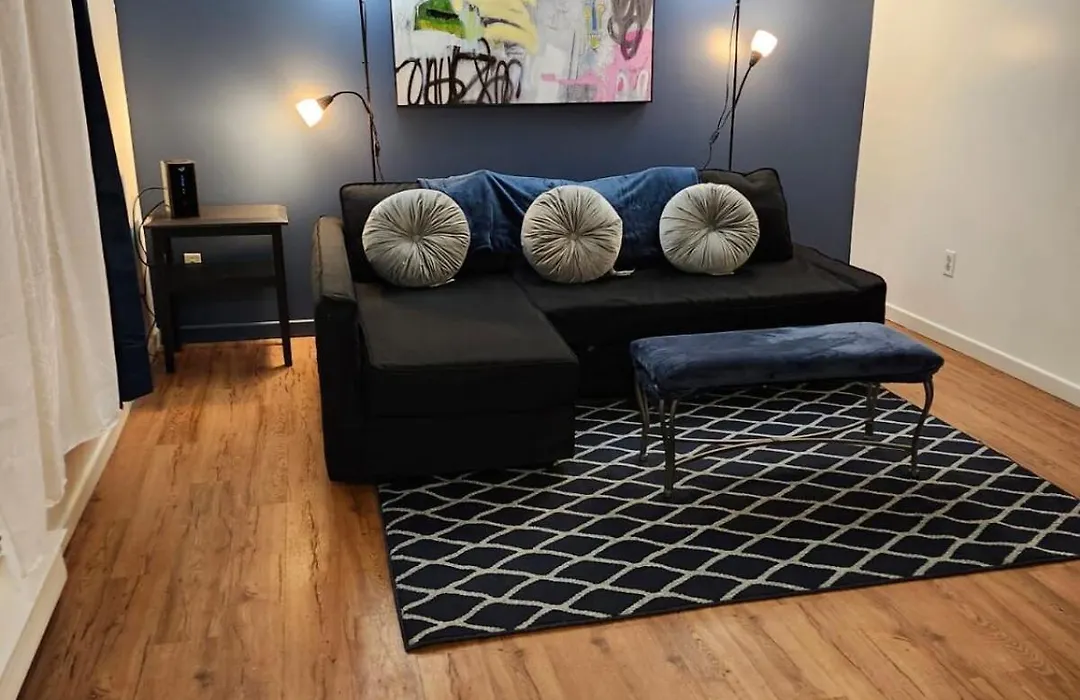 The apartment features a bathroom with a hair dryer.